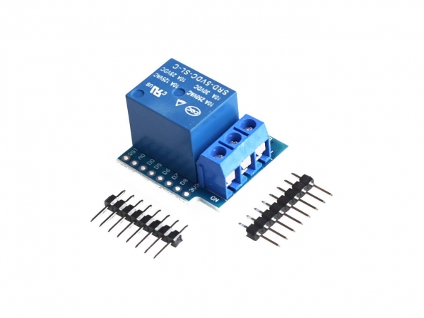 This relay shield is designed to be used with the WeMos mini & mini Pro ESP8266 based development boards. Adding this shield to your WeMos mini development board provides it with the ability to switch high voltage, or high power devices from a single digital pin. Included with the shield is a set of header pins which can be optionally fitted (soldering required) to allow for the shield to be easily inserted and removed from the D1 mini.
